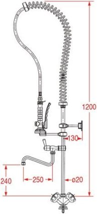 with pre-washing set spout ø 18x250 mm flow rate 17 L/min at 3 bar connection 400 mm ø 3/8"F or 1/2"M mounting hole ø 30 mm